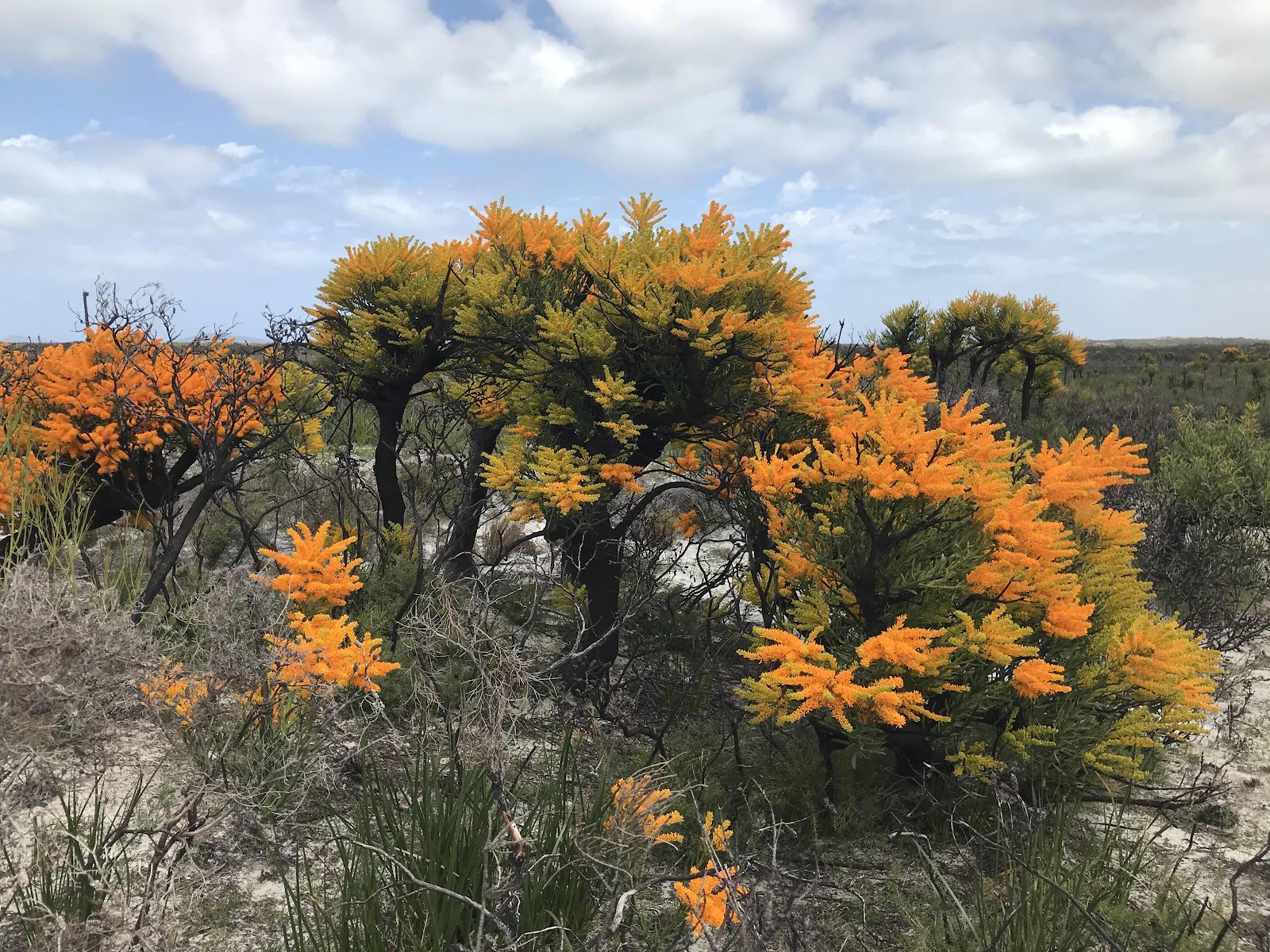 Esperance is known for its extreme and sudden temperature changes, but have you ever known 41 degrees one day and 18 degrees the next? Amazing. We had planned a bushwalk around Lucky Bay, about 60 kms to the East of Esperance. On the way we stopped to take photos as there were many more wildflowers than we expected so late in the Spring. In particular, there were vast expanses of orange Australian Christmas Trees, a parasitic plant that derives water and nutrients from the roots of other plants (so-called because they are in flower at Christmas time:
