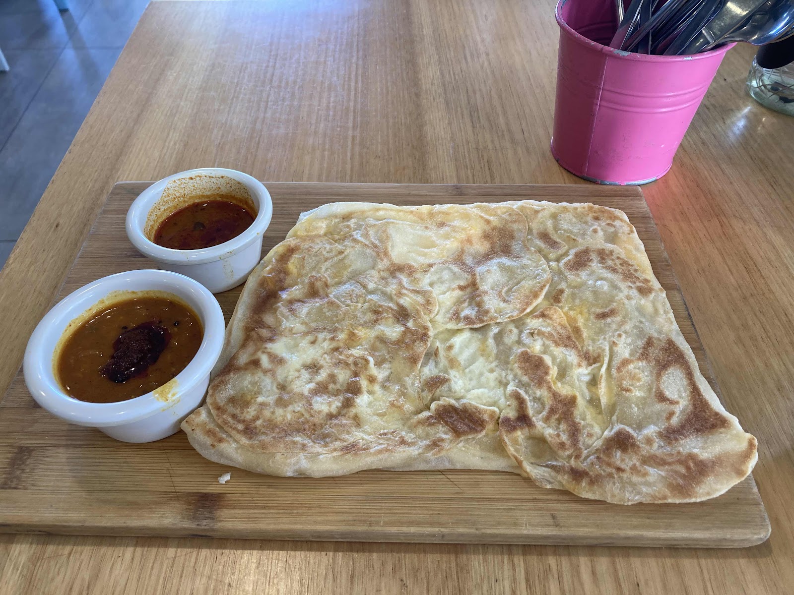 Roti telur w. spicy sauce.