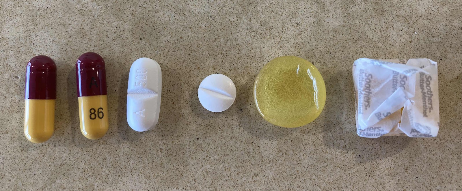 L to R: 3 antibiotics, a non prescription sleeping pill, a medicated cough pastille and a butter -menthol sweet.