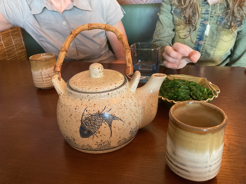 On Friday night, C knew I wouldn’t have the energy to cook for them. She took us to a local Japanese restaurant, where they ate often during their kitchen renovations. I was sad to discover that it wasn’t licensed, but the green tea came in a most beautiful pot: