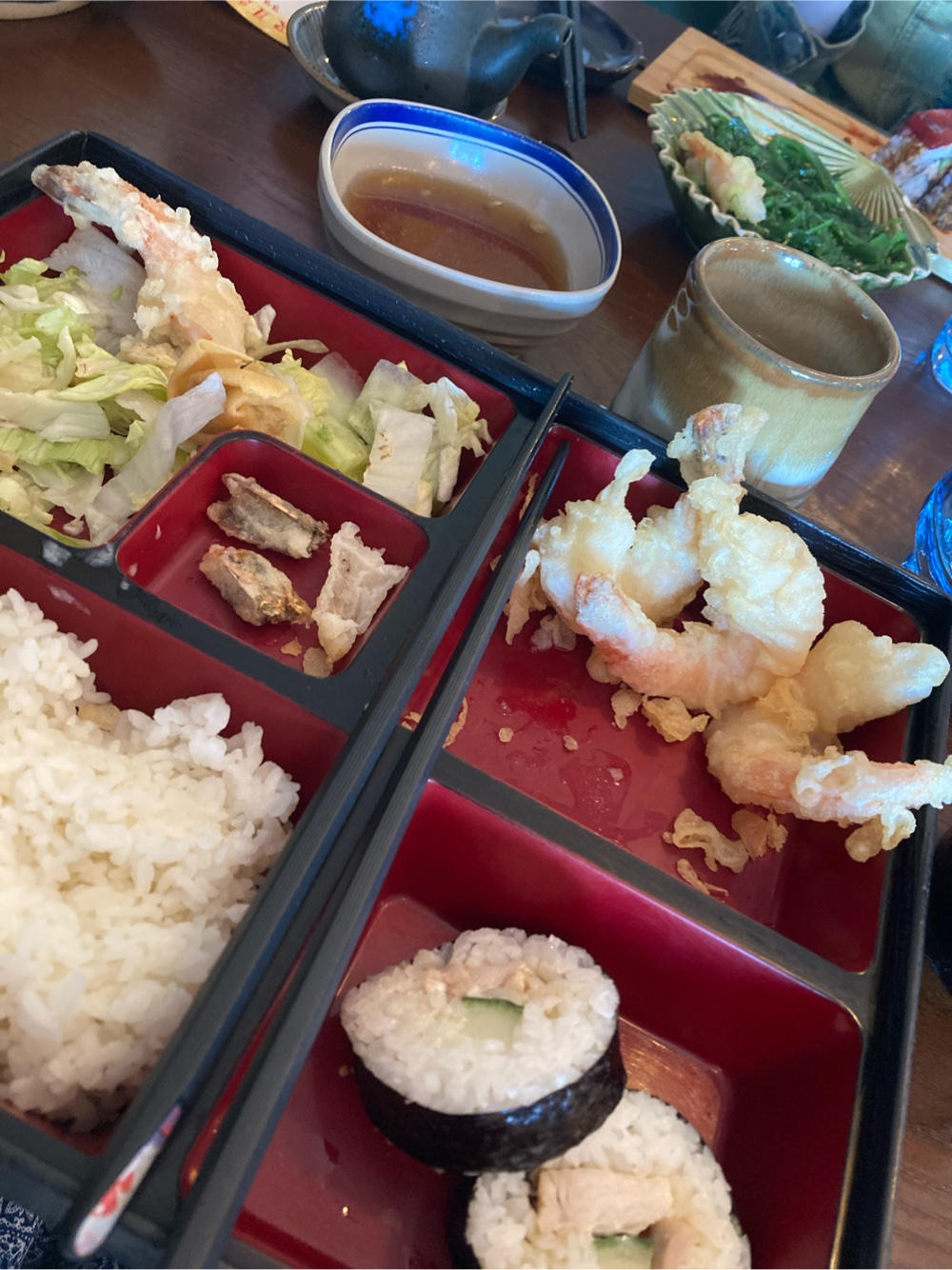 The food was delicious, though. Mine was tempura king prawns in a bento box (a generous portion and more than I could manage).