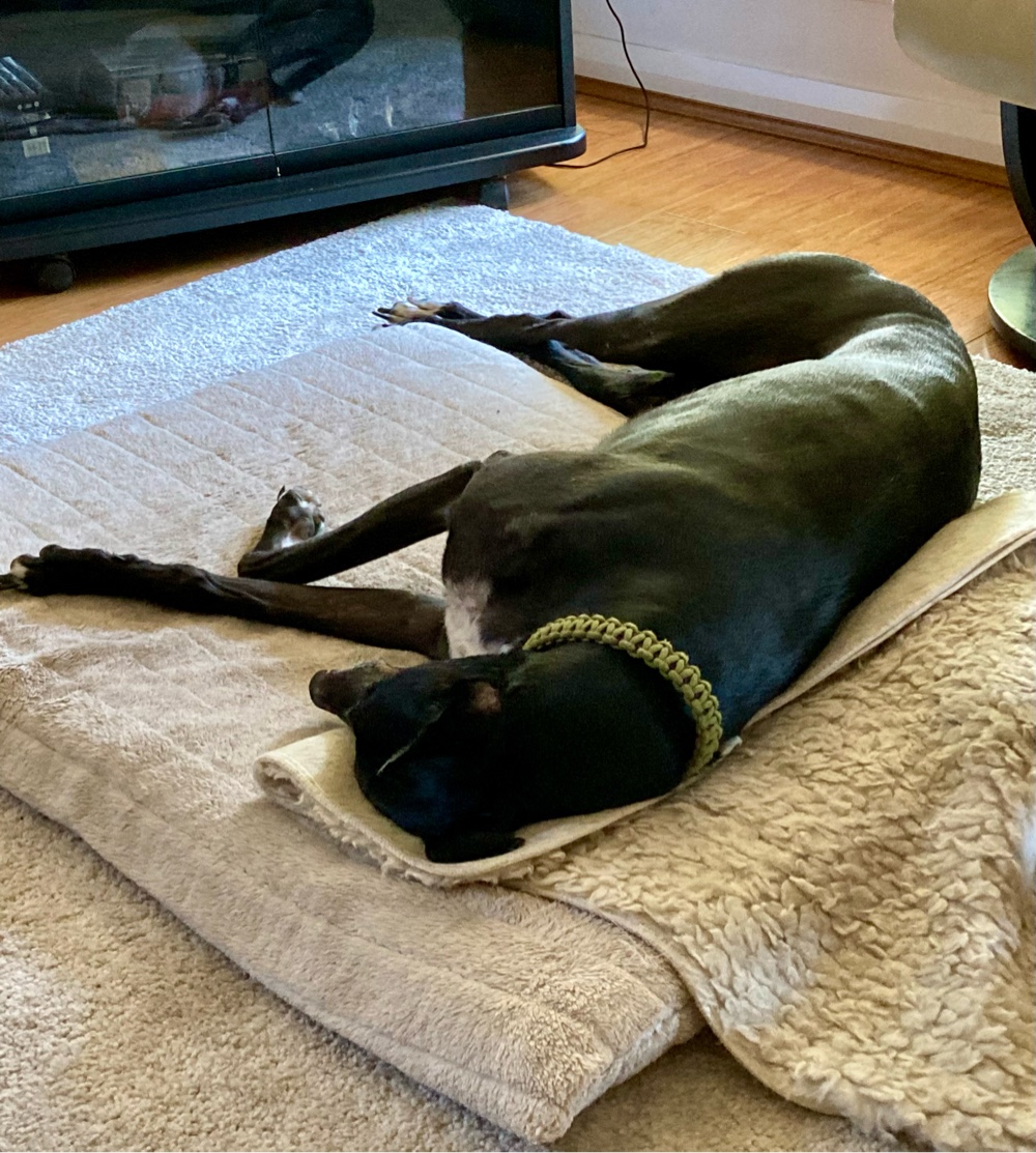 Val has a black rescue greyhound, Maggie, who sleeps most of the time: