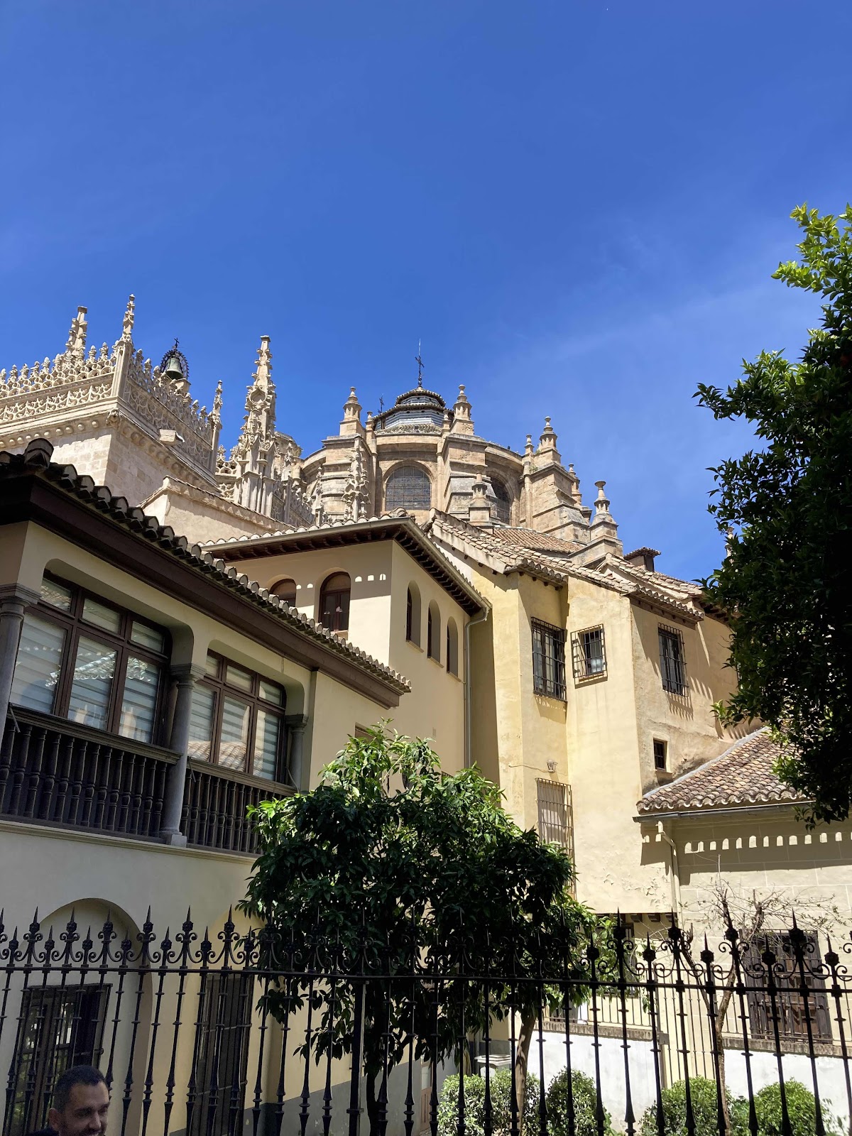 The first thing to be seen was the Capilla Real or Royal Chapel, built for the Catholic Monarchs between 1506 and 1521. There were warning signs everywhere about NO PHOTOS. I’m not sure whether this was to ensure the purchase of guide books, or simply to speed up visitor progress. It is a beautiful building and contains the tombs of Ferdinand and Isabella in lead-lined coffins in the vault, as well as their daughter, Juana the Mad, and her husband, Philip the Handsome. The following pics show statues of the Monarchs at prayer: