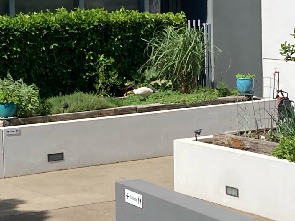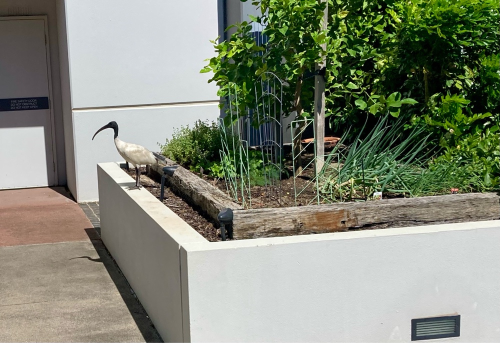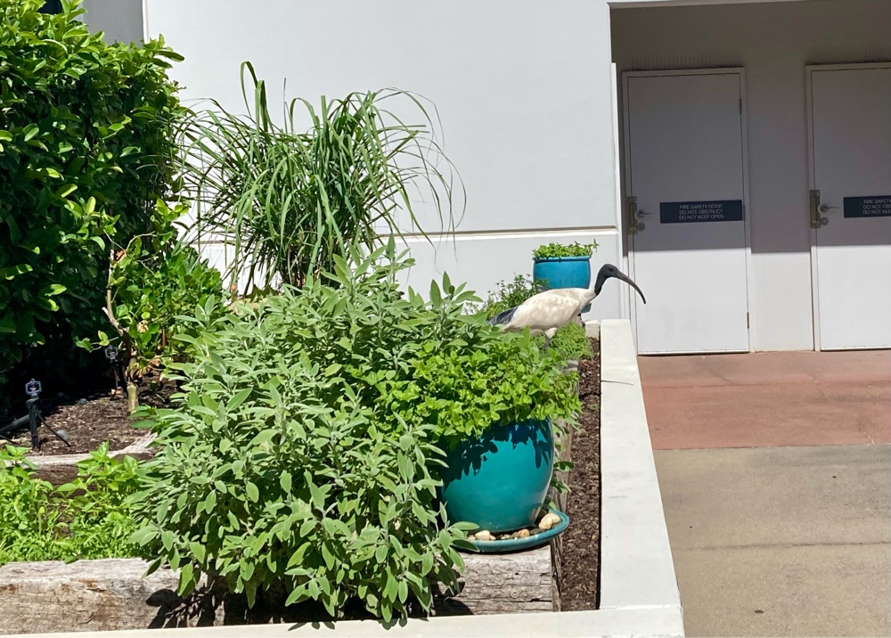 As I left the pool, I noticed an ibis checking out the communal herb garden: